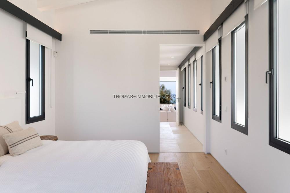 Auf einem großzügigen Grundstück von etwa 1.235 m² gelegen, bietet die Villa rund 389 m² bebaute Fläche und ist perfekt ausgerichtet, um das Morgenlicht und den weiten Meerblick einzufangen. Ein beeindruckender Holzeingang öffnet sich zu einem privaten Innenhof, der in das Herz des Hauses führt – ein geräumiger, offener Wohn- und Essbereich mit Kamin und bodentiefen Fenstern, die den mediterranen Horizont einrahmen. Die Küche ist mit erstklassigen Bora- und Gaggenau-Geräten ausgestattet und bietet hervorragenden Stauraum und Arbeitsfläche, was eine praktische und dennoch elegante Umgebung zum Kochen und Unterhalten schafft.